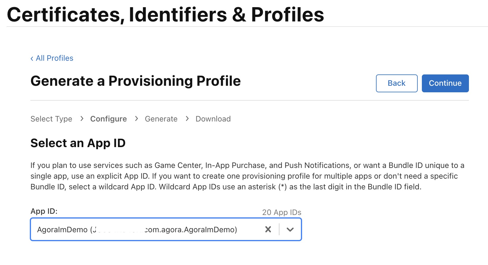 - App ID 选择需要创建 PP 文件的 App ID, 点击 Continue。