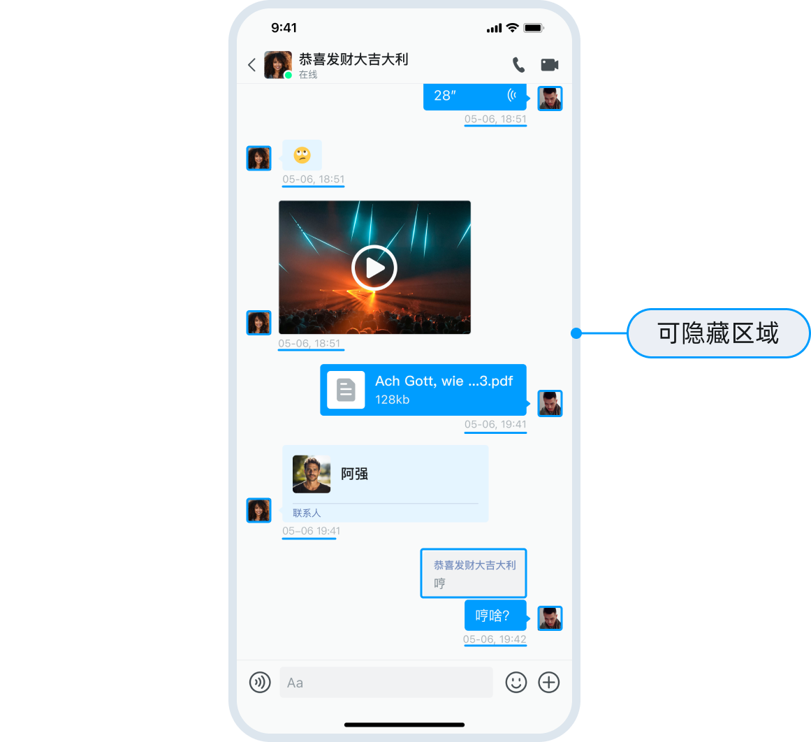 - 发送和接收消息, 包括文本、表情、图片、语音、视频、文件和名片消息。
