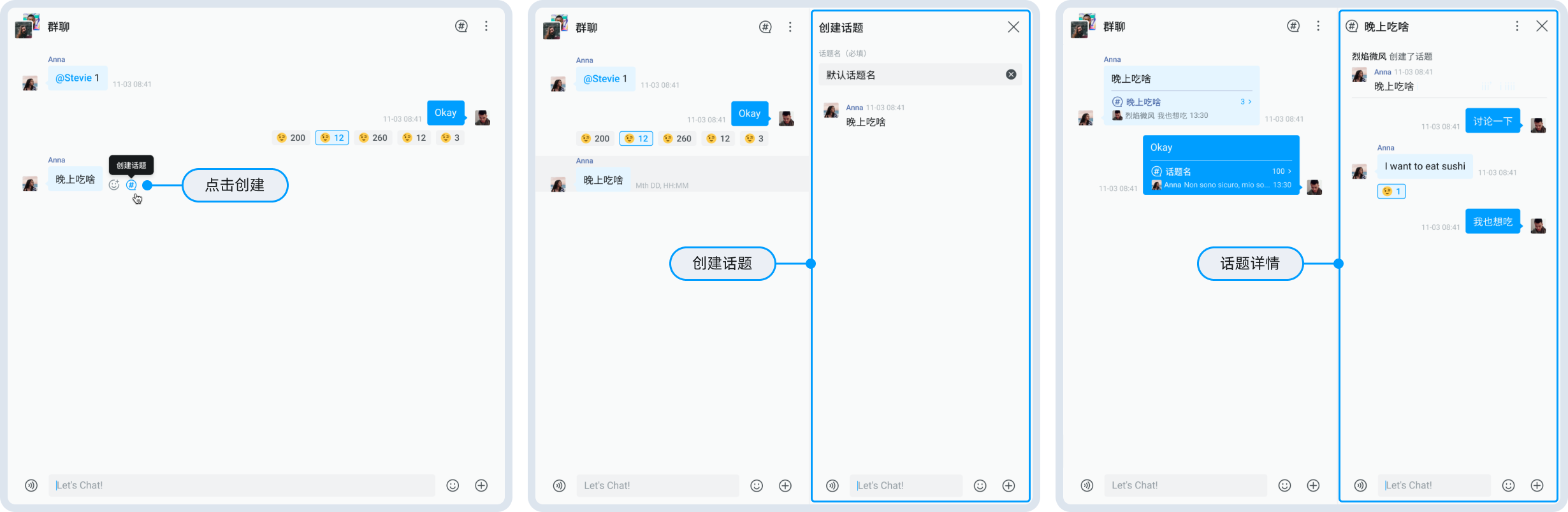 消息话题(即 Thread)指用户可以在群组聊天中根据一条消息创建话题进行深入探讨,讨论和追踪特定项目任务,而不影响其他聊天内容。